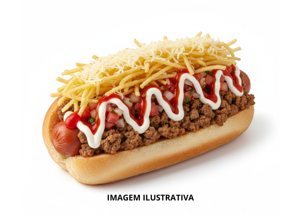 Pão de Cachorro Quente, Salsicha, Carne Moída, Verdura, Batata-Palha, Queijo Ralado e Molho