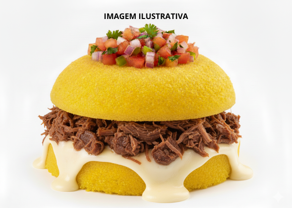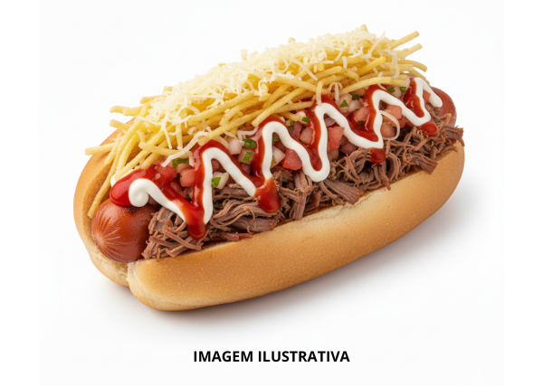 Pão de Cachorro Quente, Salsicha, Carne Cupim, Verdura, Batata-Palha, Queijo Ralado e Molho