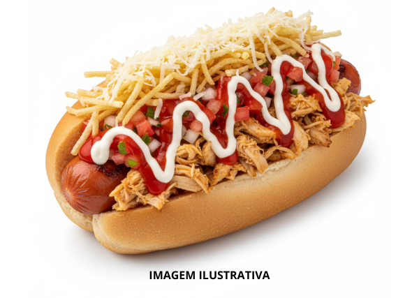 Pão de Cachorro Quente, Salsicha, Frango Desfiado, Verdura, Batata-Palha, Queijo Ralado e Molho