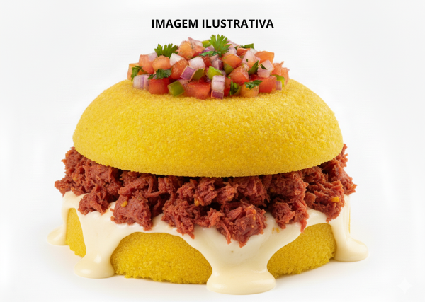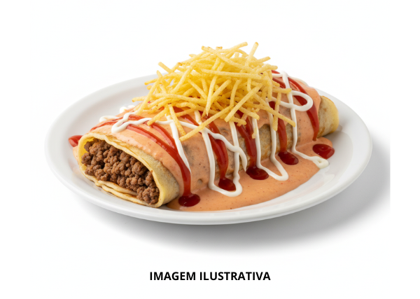 Massa de Panqueca, Molho Rosé, Carne Moída, Batata-Palha, Catchup e Maionese