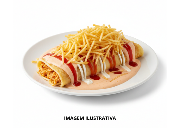 Massa de Panqueca, Molho Rosé, Frango Desfiado, Batata-Palha, Catchup e Maionese