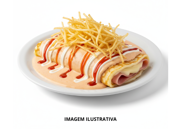 Massa de Panqueca, Molho Rosé, Quejo, Presunto, Batata-Palha, Catchup e Maionese