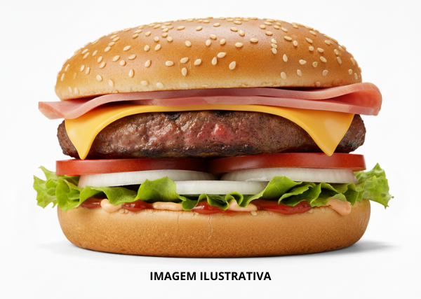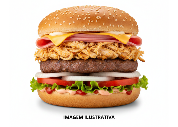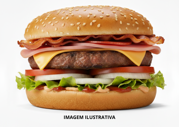 Pão de Gergelim, Carne, Salada, Queijo, Presunto, Bacon e Molho