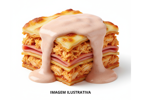 Massa de Lasanha, Molho Rosé, Frango Desfiado, Queijo e Presunto